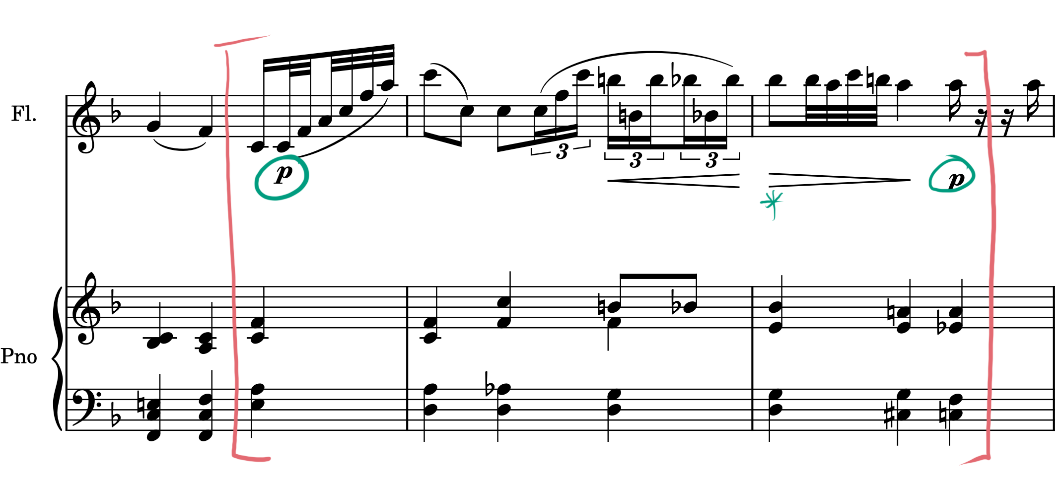 First, when we’re practicing this, we’re keeping an eighth note subdivision as the tempo in quarter notes is too slow to anticipate, keeping in mind the piano plays the quarter note beat with the exception of two eighth notes an octave apart from the flute part on beat three of the first measure of what we’re looking at. On to the disassembly: